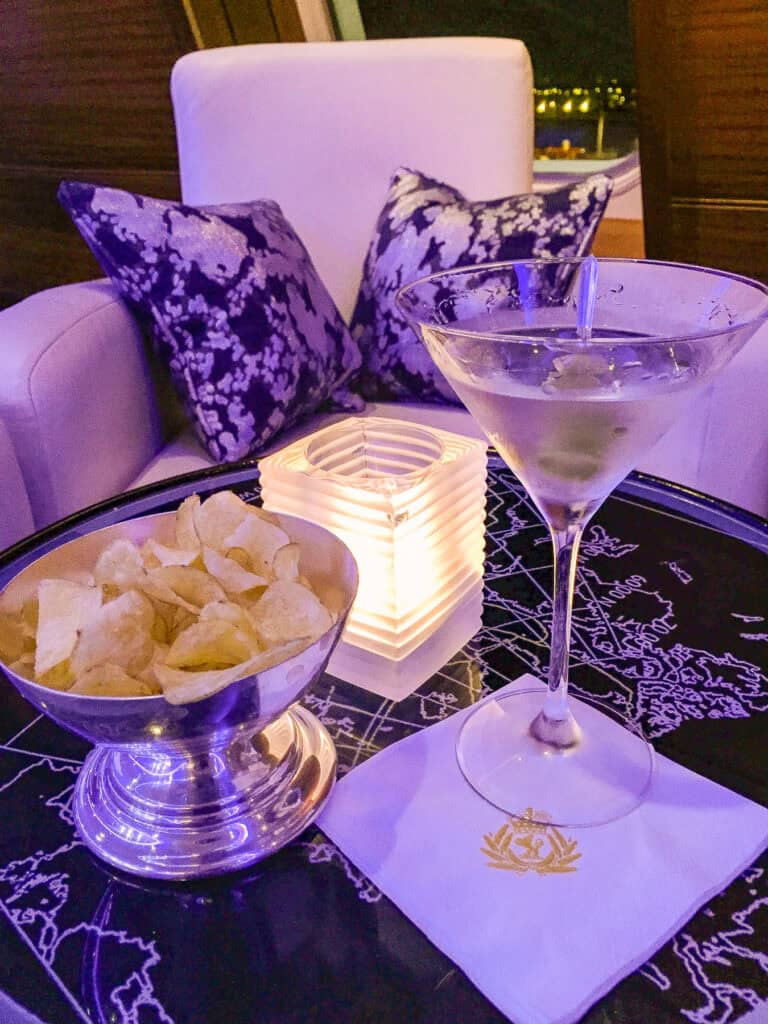 After a brief appearance at the sailaway party, I go to the Commodore’s Club on Deck 8 for a gin martini. I watch the coastline fade as the ship set out to sea and for me, that’s the true beginning of the crossing.
